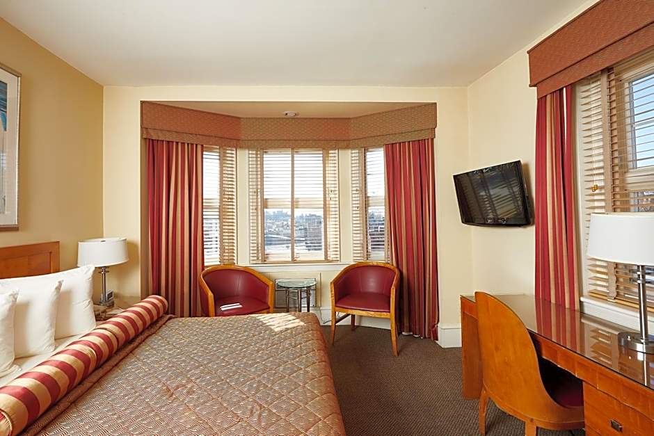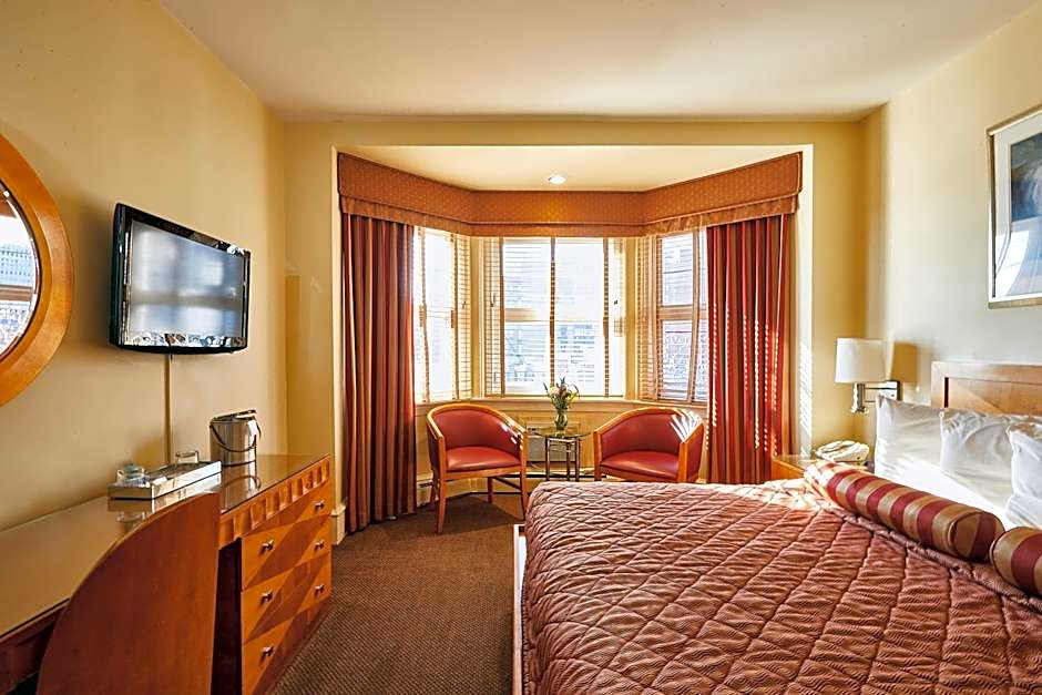 This room comes with a king bed, a bathroom with a tub/shower and bay window with a seating area.