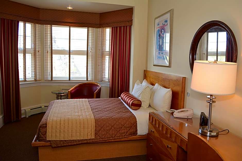 This room comes with a queen bed, a bath with tub/shower and bay window with seating area.